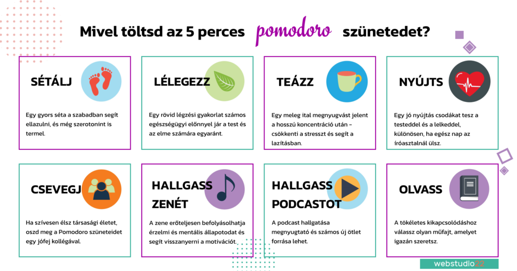 Íme néhány további ötlet a Pomodoro-szünetekre: