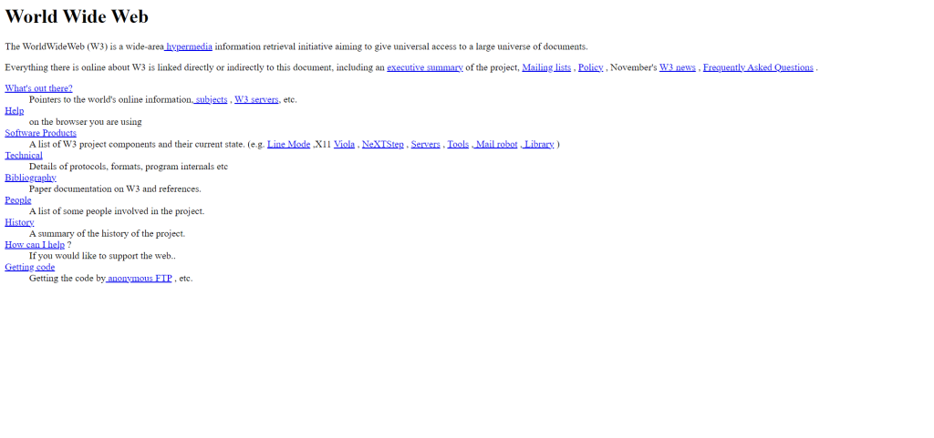 Ez a weboldal volt az első online útmutató a weboldalak létrehozásáról, és ahogy azt sejteni lehetett, csak szöveges tartalma volt.